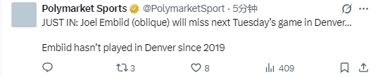 北京时间3月15日,根据Polymarket Sports报道,恩比德将缺席下周三76人队对阵掘金队的比赛。而自从2019年以来,恩比德就再未在丹佛打过球。
