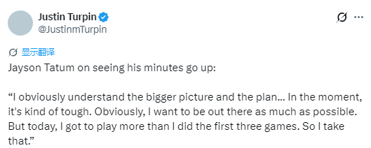 谈到自己出场时间逐步增加,塔图姆表示:“我显然理解大局和球队的计划……但当下其实挺难熬的。我当然想尽可能多上场。不过今天,我的出场时间比前三场都多,我接受这个过程。”
