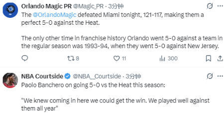 值得一提的是,这是魔术队史第二次单赛季对阵某个对手取得5胜0负的战绩,上一次还要追溯到1993-94 赛季,当时他们对阵篮网同样是5胜0负。
