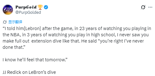 谈到詹姆斯本场飞身救球的表现,雷迪克说道:“我和他说,我看了你23年NBA生涯,再加上高中时期的3年,我从来没见过你像这样全力飞身扑球。詹姆斯自己也说:‘你说得对,我从没这么干过。’这就是为了赢球才会做出的拼抢。”