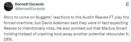 在谈到第四节最后时刻里夫斯故意罚球不中,却抢到篮板扳平比分的一球时,阿德尔曼说道:“我们预判到了他会故意罚丢,甚至听到他们在喊‘罚丢’,所以斯宾塞才去卡位。这种球就是NBA里百分之一概率会发生的那种事,发生了就得承认对手确实打得好。但在那之前,有很多地方我们本可以做得不一样、做得更好。比赛最后时刻必须罚进球,我们要是罚进了,比赛早就结束了。尤其是在他们没有暂停的情况下。这就是一场疯狂的NBA比赛。我们开局打得不够好,但我觉得下半场大家的拼劲非常棒,很多人都站了出来。也要称赞湖人,他们一直没放弃,靠着一记疯狂的罚球战术把比赛拖进加时。”