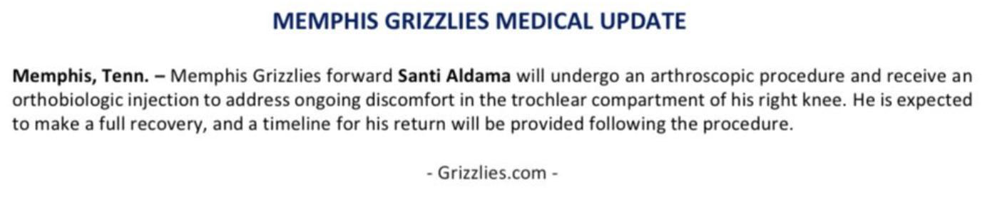 灰熊队官方在公告中写道:“阿尔达马将接受关节镜手术,并接受骨科生物制剂注射,以治疗其右膝关节滑车室持续存在的不适。预计他将完全康复,具体复出时间表将在手术后公布。”