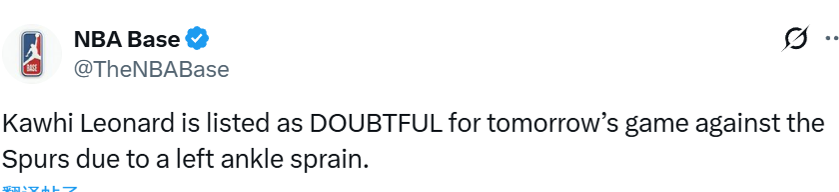 北京时间3月16日,NBA常规赛继续进行,快船明日对阵马刺。赛前,快船官方更新球队伤病情况,莱昂纳德因左脚踝扭伤被列为大概率缺阵。