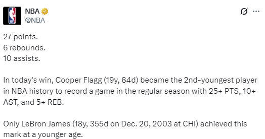 本赛季,独行侠队后卫小内姆布哈德曾单场砍下过28分10助攻,再加上今天的弗拉格,两人成为了NBA和ABA合并以来,第一对能在菜鸟赛季都曾单场拿到至少27分10助攻的新秀球员组合。