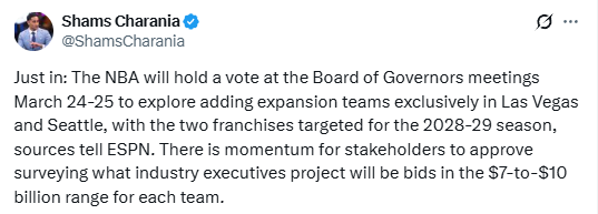 北京时间3月16日,据名记Shams报道,ESPN消息源透露,NBA将于北京时间3月25-26日在董事会会议上进行投票,仅考虑在拉斯维加斯与西雅图增设扩张球队,目标是让这两支新球队在2028-29赛季正式加入联盟。目前各利益相关方对该计划支持势头强劲,行业高管预计每支新球队的竞标价格将在70亿-100亿美元区间。