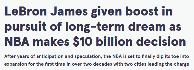 在多年的期待与猜测之后,NBA终于将在二十多年后首次启动扩军计划,西雅图和拉斯维加斯有望成为NBA两支新军所在的城市。NBA即将就期待已久的联盟扩军进行投票。美媒表示,这一消息将让詹姆斯备受鼓舞。