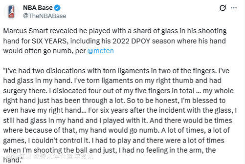 北京时间3月16日,湖人球员斯马特接受媒体采访,透露自己的投篮手内残留玻璃碎片长达6年,其中包括他斩获2022年最佳防守球员的那个赛季,那段时间他的手经常发麻。
