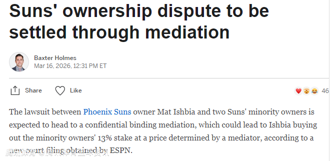 北京时间3月17日,据ESPN获取的最新法庭文件显示,太阳队老板伊什比亚与两名太阳少数股东之间的官司,预计将进入保密且具有约束力的调解程序。调解结果可能是:由调解员确定价格,伊什比亚回购这两位小股东手中13%的股份。