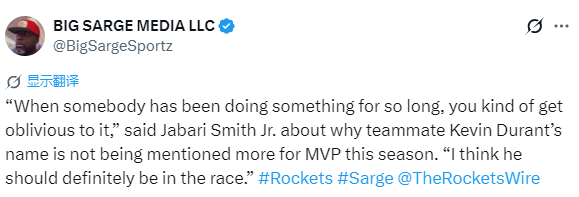 北京时间3月17日,火箭球星小贾巴里-史密斯在球队训练结束后接受媒体采访,谈及杜兰特是否应该进入MVP人选范围的话题。