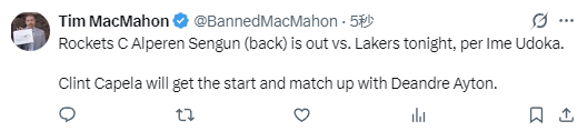 此前申京已经被火箭队列入伤病报告当中,他因背部伤势状态被列为出战成疑,而本场比赛,申京最终还是无法出战。乌度卡将启用卡佩拉作为火箭队的首发中锋,来对抗艾顿。