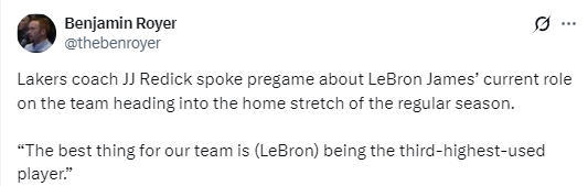 在谈到詹姆斯目前在球队中的角色时,雷迪克表示:“我的意思是,詹姆斯依然会是球权使用率很高的球员。但对我们球队最有利的安排,是让他成为球权使用率第三高的球员。显然,本赛季有很长一段时间,因为伤病或者其他球员缺阵,他不得不承担更多球权。我觉得,当那三位核心球员一起上场时,要在轮换和阵容里找到节奏和感觉,对我们所有人来说都是一个挑战。不仅仅是整个赛季,赛季初他们也没有足够的磨合时间,断断续续的。大概有两个月左右,很多时候都只能临场调整、随机应变,因为各种情况不断出现。”