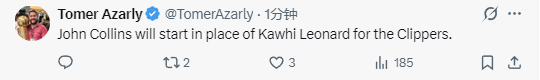 北京时间3月17日,NBA常规赛继续进行,快船队对阵马刺队。赛前,快船队官方宣布,莱昂纳德将因伤缺席本场比赛,而约翰-科林斯将顶替他进入首发阵容。