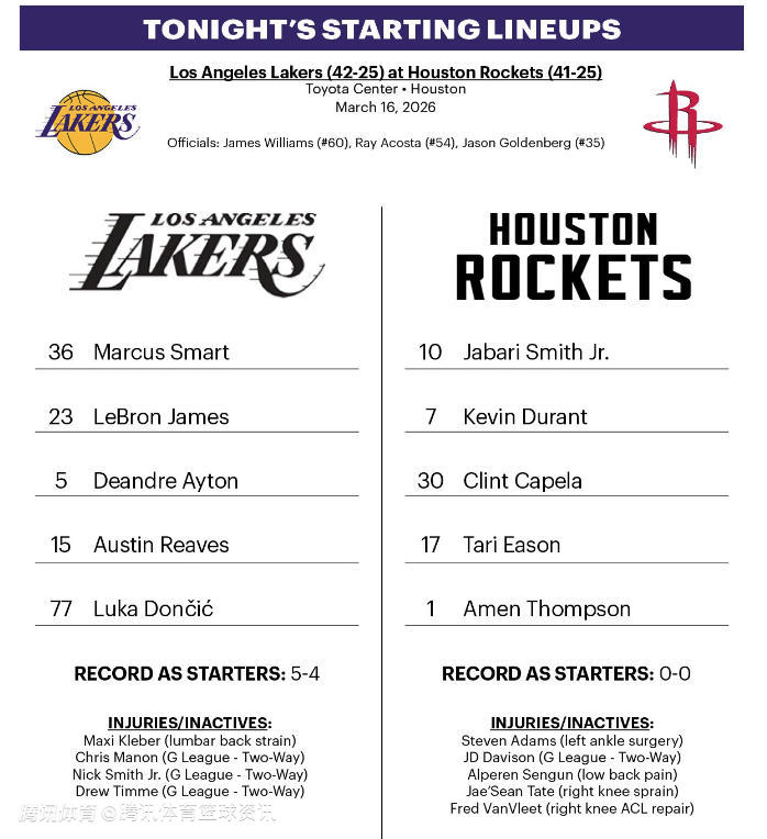 北京时间3月17日,NBA常规赛继续进行,火箭队对阵湖人队。赛前,双方公布了本场比赛的首发阵容,詹姆斯和杜兰特领衔出战,卡佩拉顶替申京出任首发中锋。