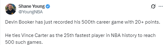 本场比赛,是布克职业生涯第500次单场得分20+,他花费了725场比赛做到这点,追平了文斯-卡特,并列NBA历史第25快。布克在比赛中曾一度连砍23分,这是他职业生涯连续砍分第二高,在2022年12月17日对阵鹈鹕队的比赛中,布克曾连续砍下25分。