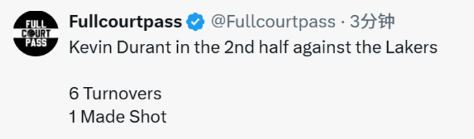 本场比赛中,杜兰特上下半场表现天差地别。下半场他遭遇湖人疯狂包夹,出现6次失误,仅投中1个运动战进球,而且这2分还是比赛最后阶段胜负已定时的上篮。湖人自媒体在评价杜兰特下半场表现时调侃道:“湖人开始对杜兰特进行包夹方式,他似乎对此无能为力,看来他确实不是东契奇。”