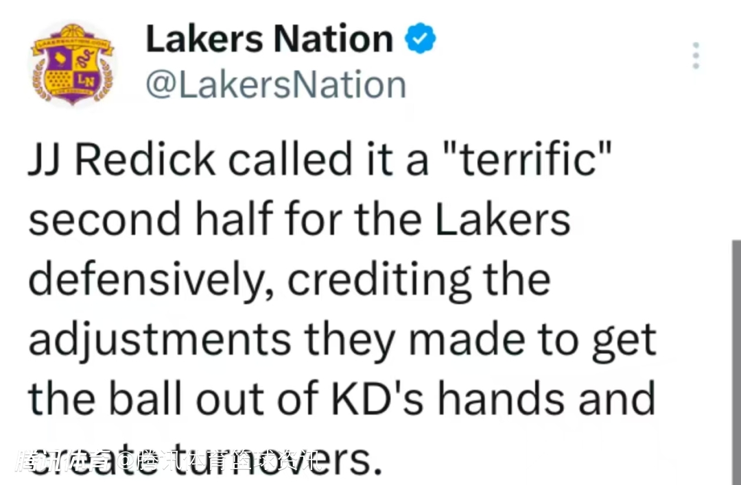 雷迪克称赞湖人下半场防守极其出色,并肯定了球队做出的调整——迫使杜兰特出球、并制造对手失误。