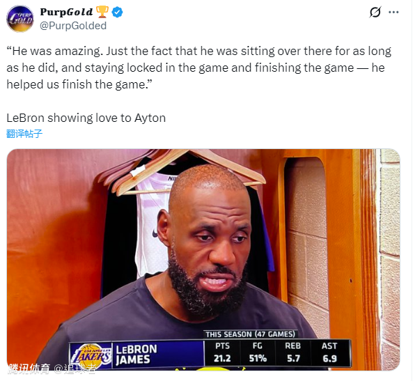 詹姆斯也称赞了艾顿本场的发挥,直言:他太棒了。他能长时间坐在场下保持专注,并在最后时刻上场帮我们终结比赛——这真的令人赞叹。