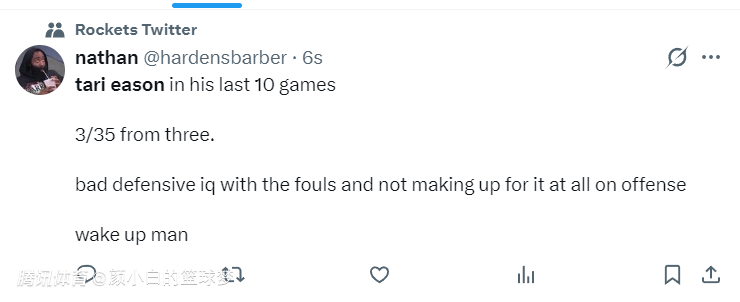 火箭球迷:伊森过去的10场比赛三分球35中3,三分命中率8.6%,防守端能力也差频繁犯规,进攻端更是一无是处。