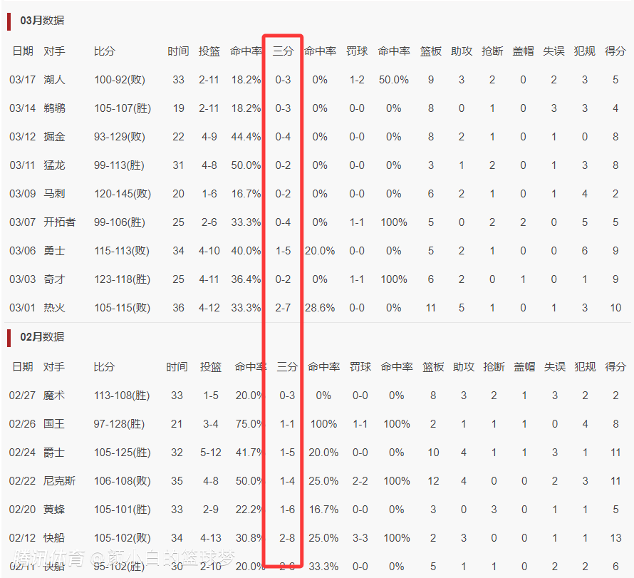 过去的6场比赛伊森三分球18中0,过去的16场比赛伊森三分球65中11,三分球命中率只有16.9%,场均只得到7.3分,投篮命中率33.1%,三分球命中率只有16.9%。伊森的表现令人无奈。