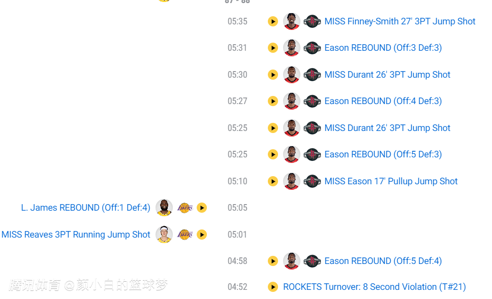 终场前4分52秒杜兰特8秒不过半场低级失误,也是这个失误让艾顿篮下补篮帮助湖人反超,终场前3分32秒杜兰特又是一个想要穿过两人包夹的传球失误,不得不说KD这一波令人很无奈,短短118秒里2铁+2失误。