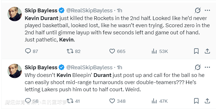 名嘴斯利普-贝勒斯疯狂朝他开炮:为什么KD不直接突破到篮下?他可以打无球啊,这样他就能轻松躲过双人包夹接球完成中距离投篮。他持球就被湖人逼到半场的位置,太奇怪了。