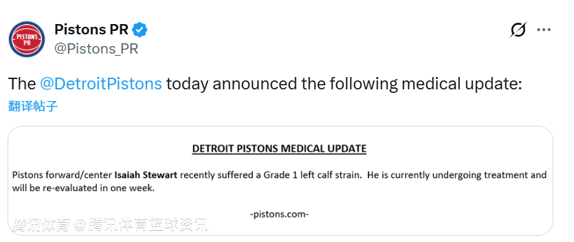 北京时间3月18日,活塞官方宣布,以赛亚-斯图尔特被确诊为小腿一级拉伤,目前正在接受治疗,预计一周后接受复查。