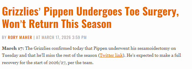 北京时间3月18日,灰熊官方发布公告,确认小皮蓬接受籽骨切除手术,本赛季提前报销。球队表示,他预计能在2026‑27 赛季开始前完全康复。