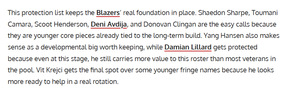 这份保护名单保留了开拓者真正的核心班底。夏普、卡马拉、亨德森、阿夫迪亚和克林根都是毫无悬念的保护人选,因为他们是球队长期重建计划里的年轻核心。