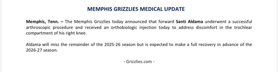 灰熊本赛季伤病不断。杰罗姆、伊迪、布兰登-克拉克、莫兰特均缺席了大量比赛。波普上月接受手指手术后,也已确定无缘2025‑26赛季剩余赛事。