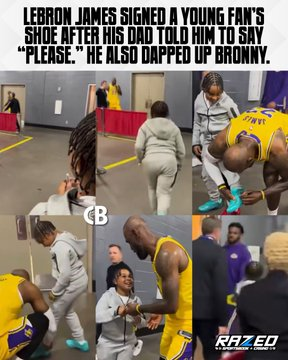 詹姆斯在一位小球迷的爸爸提醒他说“请!”之后,为这位小球迷亲签球鞋。