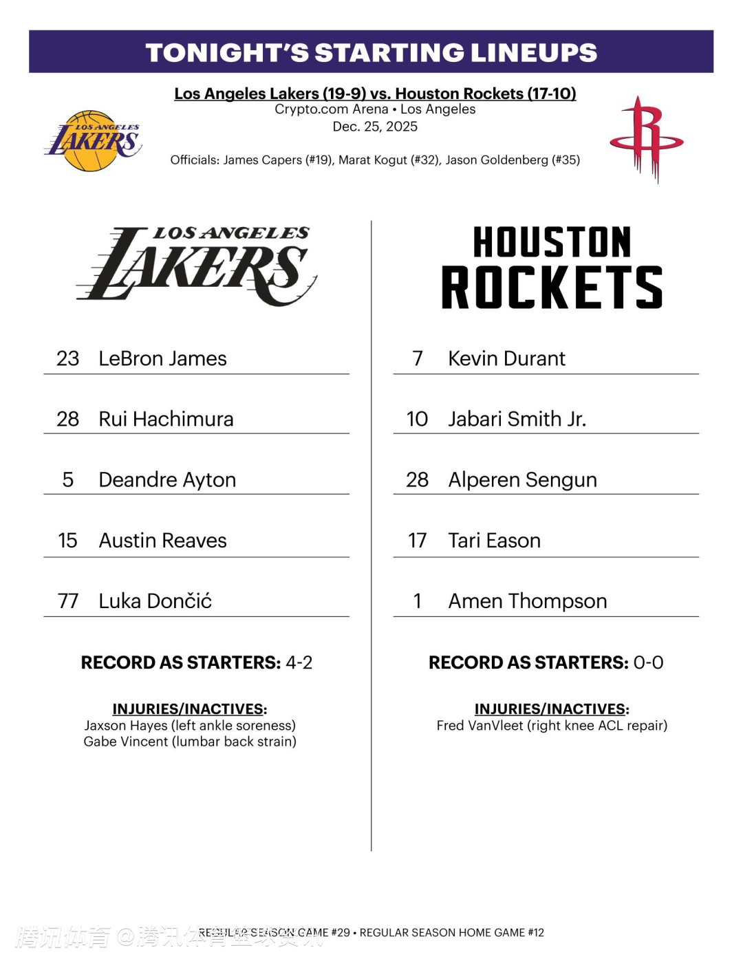 北京时间12月26日,NBA圣诞大战继续进行,湖人队对阵火箭队。赛前,双方公布了本场比赛的首发名单。