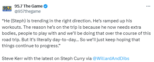 谈及库里的恢复进度,科尔表示:“他正朝着正确的方向前进,训练强度也在提升。他随队出征客场,是因为他现在需要更多和队友一起进行对抗训练,我们会在这次客场之旅中安排这些内容。不过他的复出时间依旧是每日评估,我们只能期待情况持续好转。”