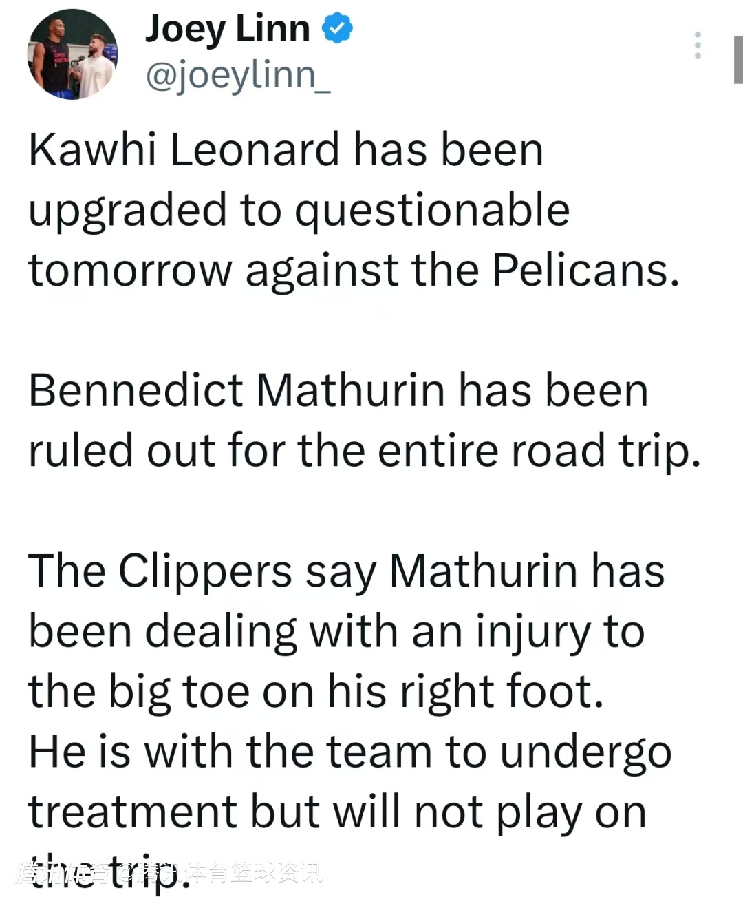 北京时间3月18日,快船队记Joey Linn今日更新球队前锋马瑟林的伤情。据悉,马瑟林遭遇右脚大脚趾伤势,目前虽随队接受治疗,但将缺席本次快船的全部客场比赛。