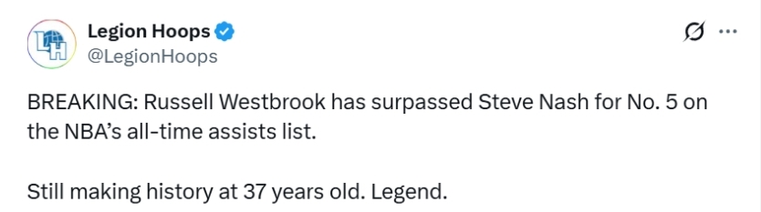 本场比赛之前,威斯布鲁克生涯总助攻数为10333次,首节比赛他送出了2次助攻,超越马克-杰克逊,追平史蒂夫-纳什,已升至NBA历史第5位。随后在第二节比赛中,威斯布鲁克助攻队友篮下得分,完成了对纳什的超越。