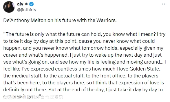 我觉得我已经无数次表达过,我有多爱金州勇士,从医疗团队、工作人员、管理层,到曾经在这里的球员、现在的球员,我对这里的喜爱是真真切切的。但说到底,我还是走一步看一步,看看事情会如何发展。”