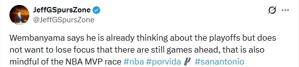 文班亚马谈到了MVP的竞争,他表示:“我已经在考虑季后赛,但不想因此分心,但毕竟常规赛仍在继续,我也还会留意着常规赛MVP的竞争。”