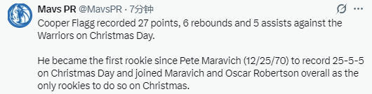 北京时间12月26日,NBA圣诞大战继续进行,勇士队126-116击败独行侠队。本场比赛,独行侠队球员库珀-弗拉格砍下27分6篮板5助攻,他也创造了多项纪录。