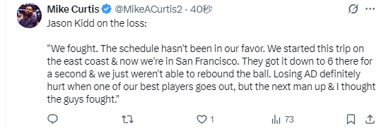 基德透露,目前暂无安东尼-戴维斯的伤情更新,而在谈到独行侠队此役失利的原因时,基德说道:“我们拼尽全力了。赛程安排确实对我们不利。我们这次客场之旅从东海岸出发,现在又来到了旧金山。比赛一度把分差缩小到6分,但我们就是无法保护好篮板球。安东尼-戴维斯的缺阵对我们影响很大,毕竟他是我们最出色的球员之一,但我们的替补球员顶了上来,我认为大家都拼尽了全力。”