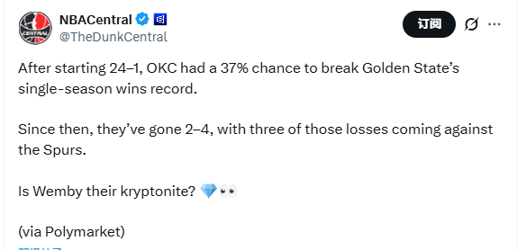 根据Polymarket提供的数据显示,雷霆开局24胜1负时,冲击勇士单赛季73胜的胜场纪录概率达37%;此后仅2胜4负,其中3场都输给马刺,另一场不敌森林狼。目前雷霆打破NBA单赛季胜场纪录的概率仅为5%。