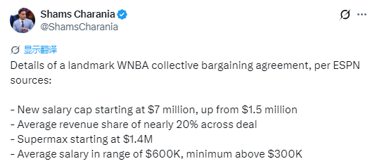北京时间3月18日,名记Shams报道,据ESPN消息源透露,WNBA达成里程碑式新劳资协议。