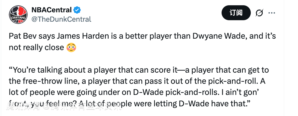 “没错,韦德有没有关键球?绝对有。有时候我们是不是见过韦德的关键球比哈登更硬?是的,见过。但论谁是更好的球员,纯个人能力,哈登比韦德更强。大家搞混了,因为大家总拿冠军说事儿,冠军这东西你没法否认。但冠军是团队荣誉,那是球队奖项。我在说的是个人能力,纯个人对比,你必须选哈登。”