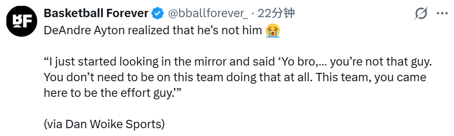 “我开始对着镜子告诉自己:‘兄弟,你不是那个角色。在这支球队里,你完全不需要做那种事。’”他解释道,“你来这支球队,就是要做那个拼尽全力的人,做好防守终结、抢篮板,玩命跑快攻,让对面的内线累到不行,让对面的巨星打得难受。说实话,我现在很享受这个过程。”