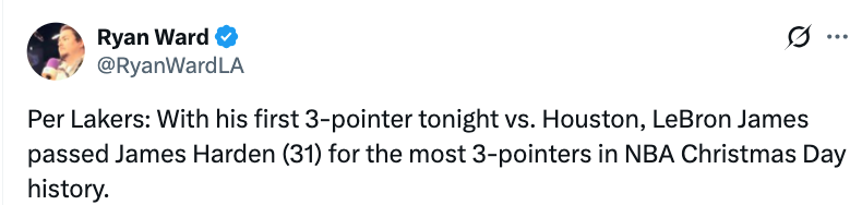首节比赛,詹姆斯命中一记三分,其生涯圣诞大战三分命中数达到32记,超越哈登(31记),成为圣诞大战历史三分王!