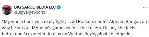 申京:我的下背部——整个背部都非常僵硬,移动很不顺畅。我一直在尝试训练恢复,希望自己能变得更好、更健康。