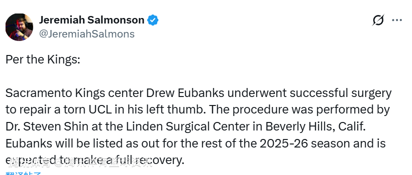 北京时间3月19日,据国王队记肖恩-坎宁安报道,尤班克斯已成功接受了左手拇指尺侧副韧带(UCL)撕裂修复手术,他将缺席本赛季剩余所有比赛。