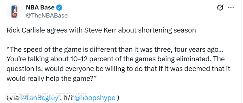 卡莱尔说道:“如今比赛的节奏和强度,与三、四年前已经完全不同了……我们说的是(整个赛季)减少10%到12%的比赛场次。问题在于,如果事实证明这真的对比赛有益,所有人是否都愿意这么做?”