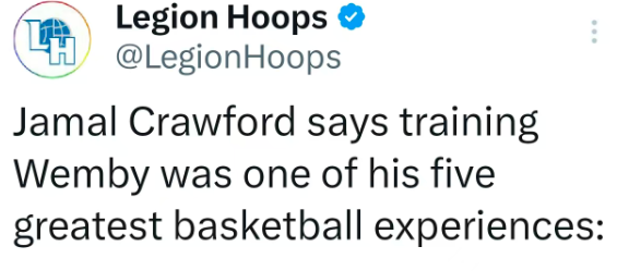 北京时间3月19日,NBA名宿贾马尔-克劳福德在接受采访时表示,训练文班亚马是他职业生涯最棒的五次篮球经历之一。