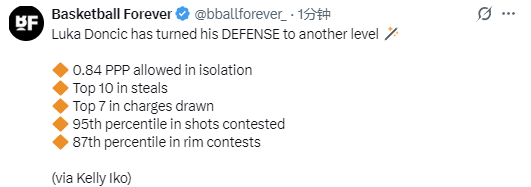 北京时间3月19日,NBA记者Kelly Iko发文并晒出多项数据,证明湖人球员东契奇的防守已经明显进步。