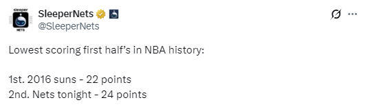 整个上半场,篮网队总计38投9中,投篮命中率只有24%,三分球16投1中,三分球命中率仅6%。全队出现15次失误,因失误丢掉22分。而篮网队上半场24分,比雷霆队任意一节的得分都要更低(首节28分,次节32分)。