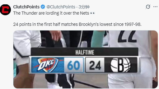 北京时间3月19日,NBA常规赛继续进行,雷霆队半场60-24领先篮网队36分。上半场24分,也创下了篮网队自1997-98赛季(数据统计时代)以来的上半场最低得分。这也是NBA历史上半场第二低分,仅次于2016年太阳队的上半场22分。